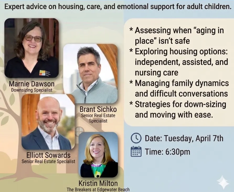 Brant Sichko & Elliott Sowards of The Chicagoland Real Estate Advisors Team along with Marnie Dawson of Dawson Relocation Services, and Kristen Milton from The Breakers at Edgewater Beach will be live to answer any and all of your questions pertaining to parents who are aging out of their homes, and how to start the process of the transition to independent or assisted living.